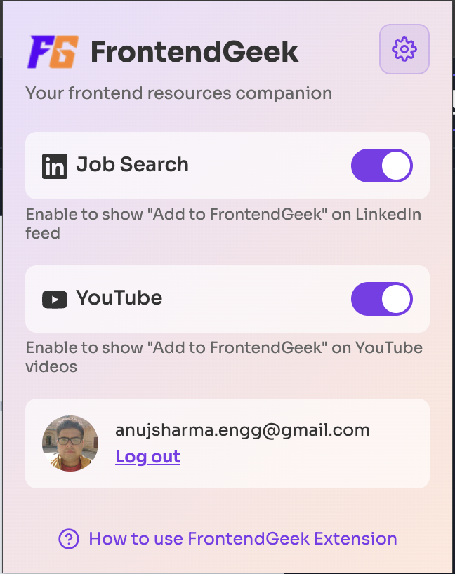 Sign in with the same Google account you use on frontendgeek.com. All your saved jobs and contributions sync across the extension and website automatically.