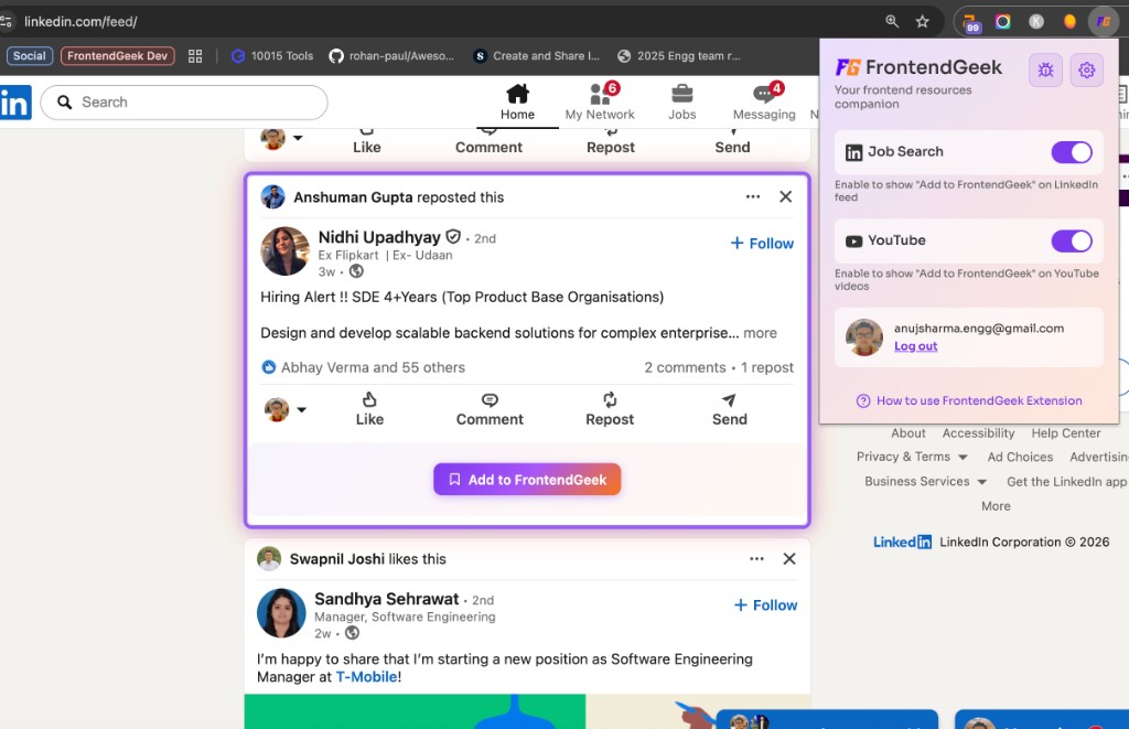 Turn on the Job Search toggle in the extension. The extension will show an 'Add to FrontendGeek' button on LinkedIn posts that mention frontend-related keywords.