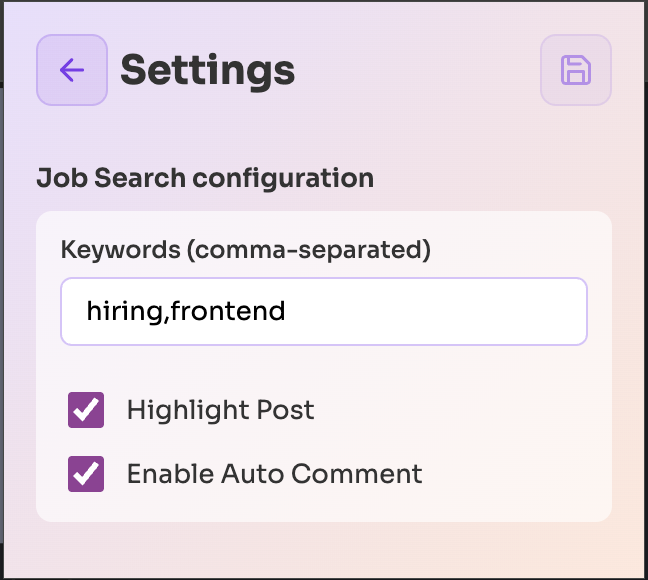 The extension automatically detects frontend-related posts based on keywords. Enable Job Search and relevant posts will show the save button—no manual filtering needed.